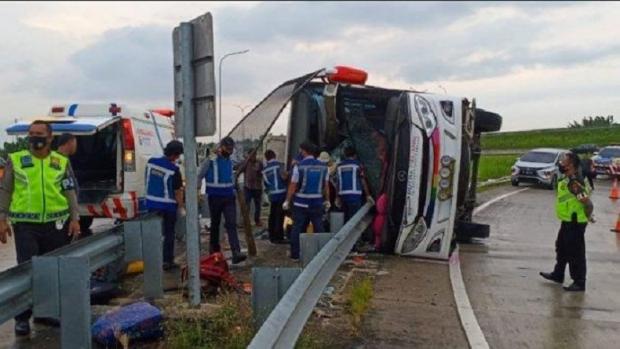 Peristiwa ini terjadi pada Senin pagi, sekitar pukul 06.30 WIB. Bus tersebut kehilangan kendali saat melaju di jalan raya yang licin akibat hujan, sehingga terguling ke sisi kiri jalan dan menabrak pembatas. Petugas kepolisian yang tiba di lokasi segera melakukan evakuasi korban dan membawa mereka ke rumah sakit terdekat.